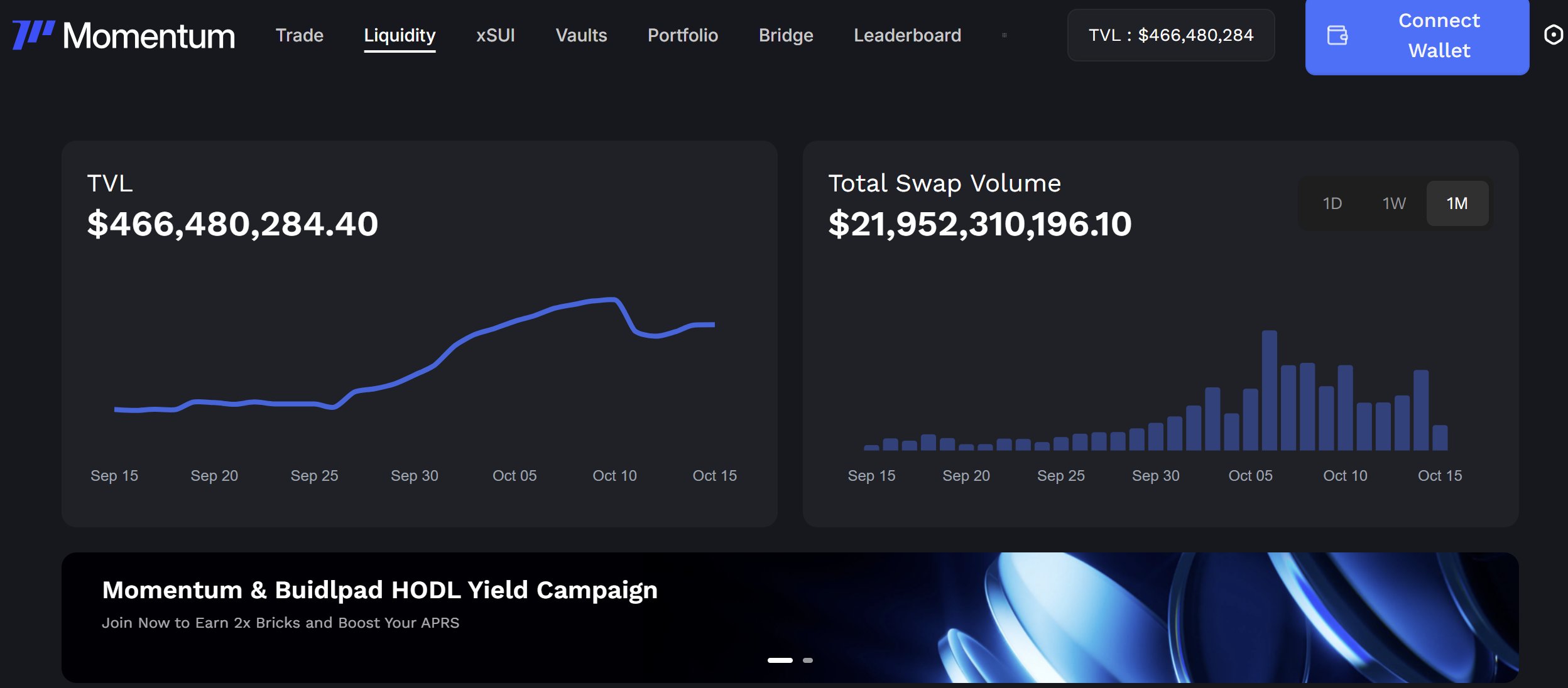 Momentum 自 2025 年 3 月推出,市場表現(xiàn)強勁:交易量達 30 億美元,TVL 6900 萬美元,用戶超 42 萬,占據(jù) Sui DeFi 市場的 20%+ 份額。