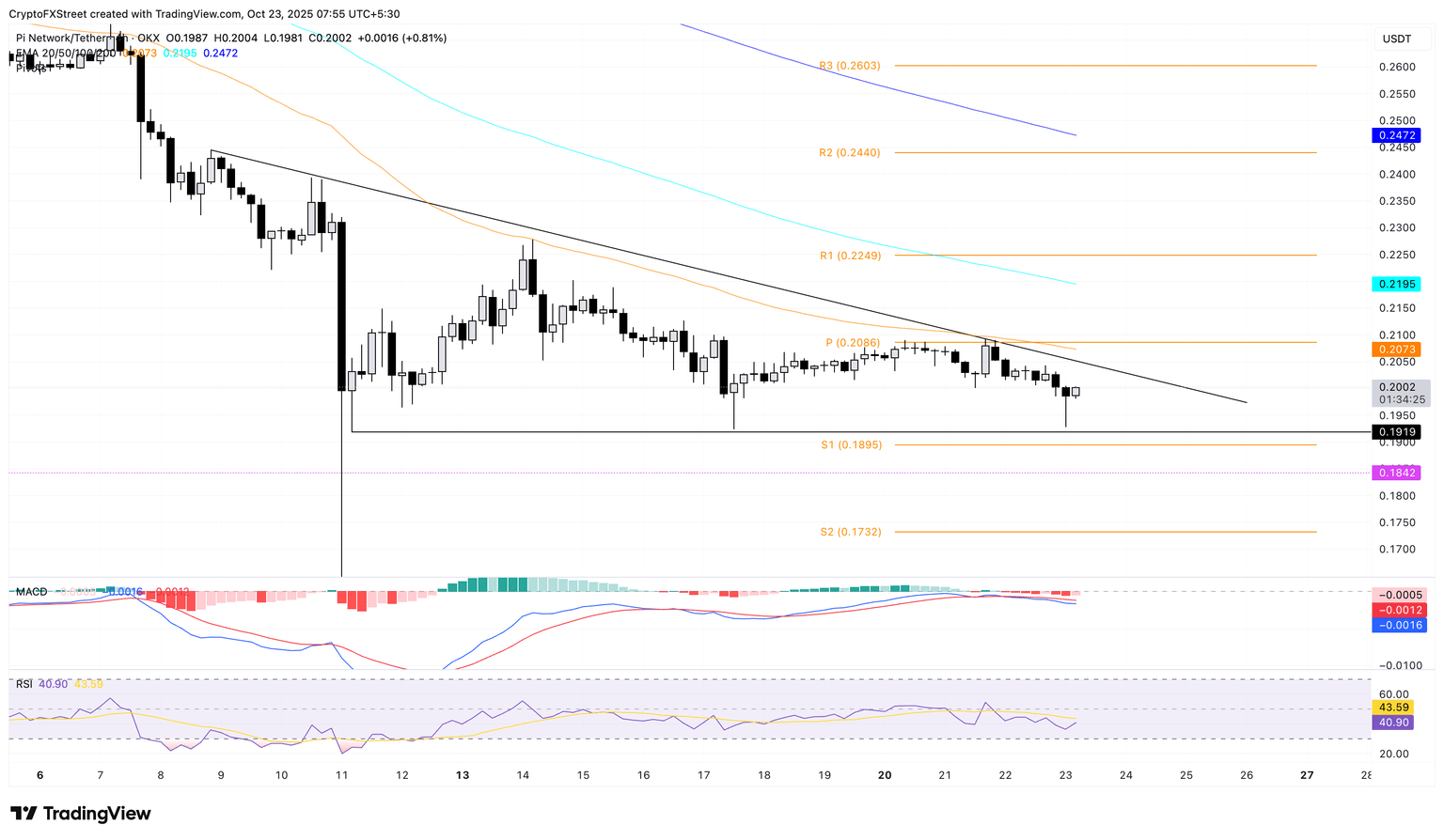 Pi Network 維持在 10 月 11 日 4 小時(shí)蠟燭低點(diǎn)形成的 0.1919 美元支撐位上方?;€完成了具有局部阻力趨勢(shì)線的下降三角形形態(tài)。