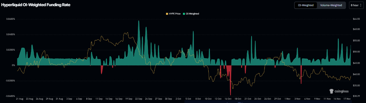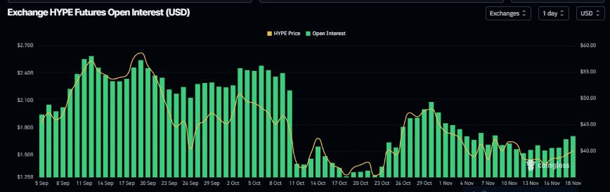 CoinGlass的數(shù)據(jù)顯示,HYPE期貨在交易所的未平倉合約(OI)周二升至17.1億美元,高于11月12日的15.2億美元,此后一直穩(wěn)步增長。OI的上升意味著有新的資金或額外的資金進入市場,這可能導(dǎo)致HYPE價格的持續(xù)上漲。