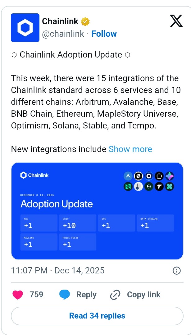 Chainlink (LINK)該公司已證實(shí)其標(biāo)準(zhǔn)正被越來(lái)越多地采用,并繼續(xù)在去中心化預(yù)言機(jī)市場(chǎng)占據(jù)主導(dǎo)地位。根據(jù)其最新更新,過(guò)去七天內(nèi),該標(biāo)準(zhǔn)已在 10 條不同的區(qū)塊鏈和 6 項(xiàng)服務(wù)中實(shí)現(xiàn)了 15 次集成。