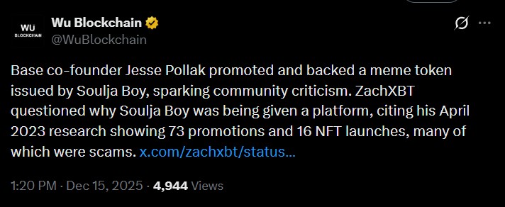 Base聯(lián)合創(chuàng)始人杰西·波拉克支持說(shuō)唱歌手Soulja Boy Meme Token結(jié)果卻立即適得其反。