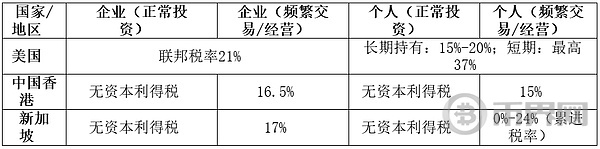 相比之下,新加坡和香港的資本利得稅政策則友好很多。這兩地目前對(duì)個(gè)人和企業(yè)因非經(jīng)常性投資而獲得的加密貨幣資本利得均不征稅。這意味著,只要相關(guān)交易被認(rèn)定為資本項(xiàng)下的投資收益,投資者便無(wú)需為資產(chǎn)升值部分繳稅,從而真正實(shí)現(xiàn)長(zhǎng)期持有的零稅率紅利。當(dāng)然,若納稅人的行為被視為頻繁交易或作為經(jīng)營(yíng)性業(yè)務(wù),則需就其利潤(rùn)繳納企業(yè)(或個(gè)人)所得稅。新加坡稅務(wù)機(jī)關(guān)會(huì)按約17%的企業(yè)所得稅征稅,個(gè)人則根據(jù)收入水平適用0%-24%的累進(jìn)稅率;香港則對(duì)經(jīng)常性加密交易的利潤(rùn)(公司稅率為16.5%,個(gè)人稅率為15%)征稅。雖然頻繁交易者依然需繳稅,但相較于美國(guó)的最高37%的個(gè)人稅率或21%的聯(lián)邦企業(yè)稅,香港和新加坡的稅率無(wú)疑具備更強(qiáng)的競(jìng)爭(zhēng)力。?